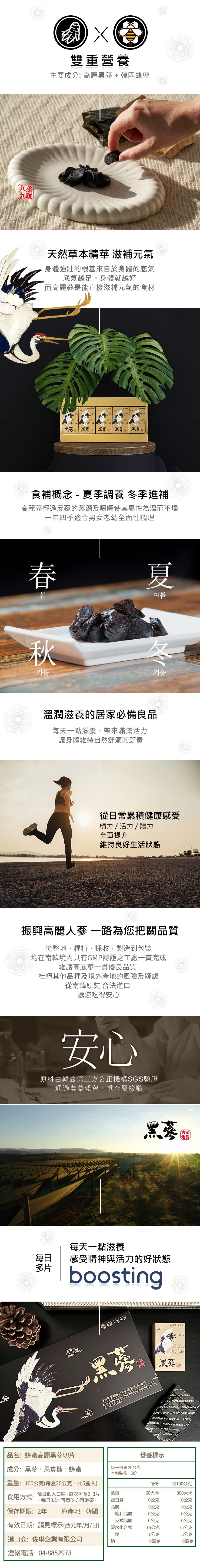 | 成份 | 黑蔘、果寡糖、蜂蜜。 |
