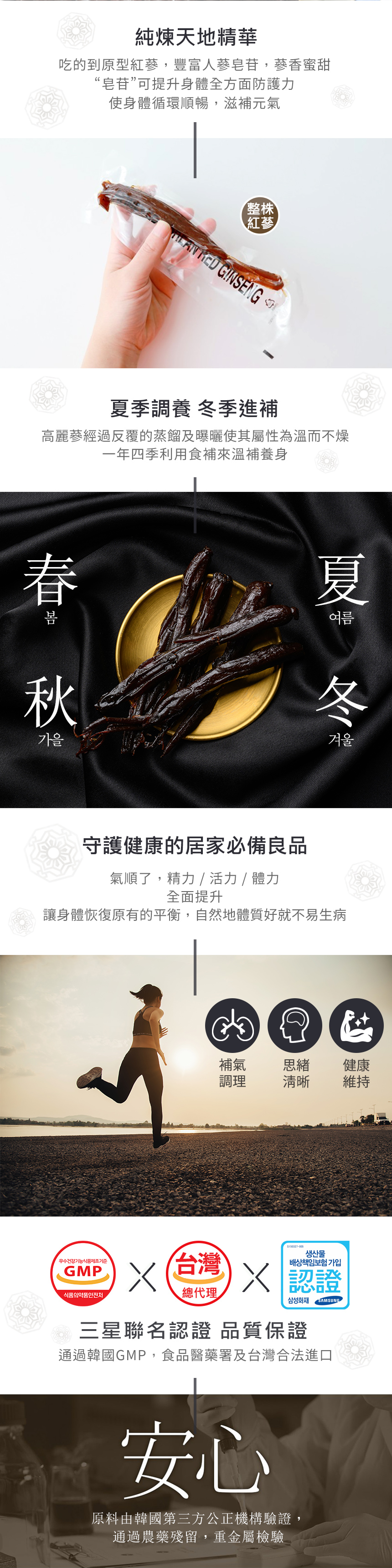 | 成份 | 紅蔘、果糖、蜂蜜。 ※ 嚴選韓國產4年根以上高麗紅蔘。 |