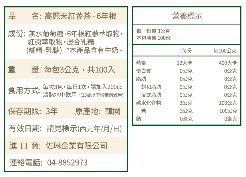 | 成份 | 無水葡萄糖、6年根紅蔘萃取物(10%)、紅棗萃取物、混合乳糖 (糊精、乳糖)。※本產品含有牛奶。 |