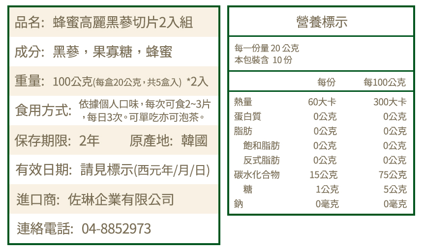 | 成份 | 黑蔘、果寡糖、蜂蜜。 |
