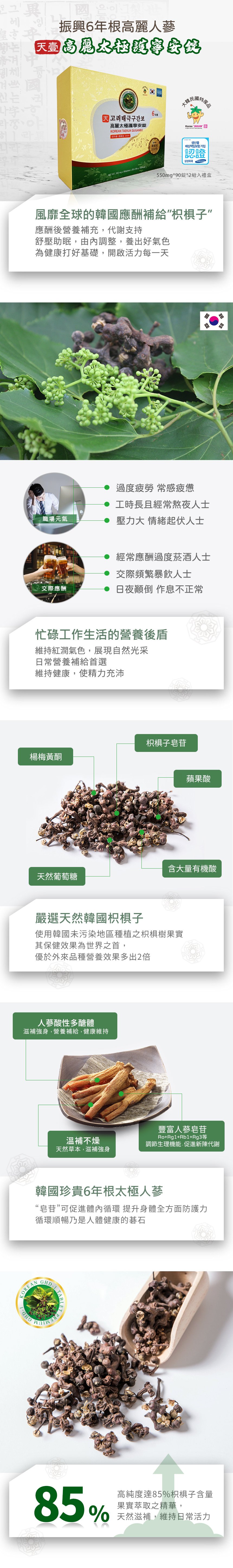 | 成份 | 枳椇子萃取物粉 (含糊精, 枳椇子萃取物) ,人蔘粉,無水葡萄糖,羥丙基甲基纖維素,微結晶狀α-纖維素,硬脂酸鎂,維生素C,牛磺酸,檸檬酸,維生素B1,維生素B2。 |