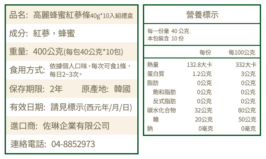 高麗蜂蜜紅蔘條 40g*10入組禮盒