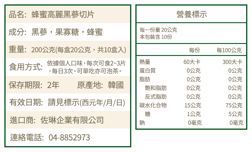 | 成份 | 黑蔘、果寡糖、蜂蜜。 |